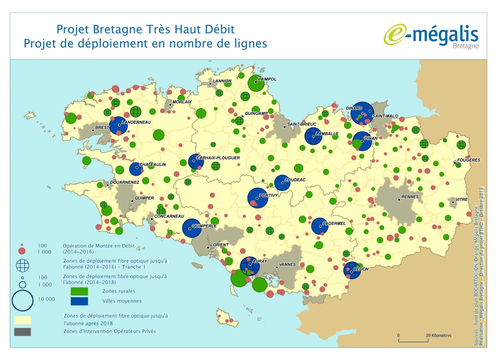 La carte du nombre de lignes indique la stratégie adoptée par le projet Bretagne Très Haut Débit, pour connecter tout le territoire. On voit que les zones côtières bénéficieront d'une opération de montée en débit, de 2014 à 2016. Les zones rurales ne sont pas non plus oubliées, où de nombreuses villes moyennes comme Pontivy seront équipés en fibre optique.Il s'agit d'un atout incontestable pour les promoteurs immobiliers bretons, dont les clients pourraient fort bien bénéficier d'un très haut débit le jour de la remise des clés.
