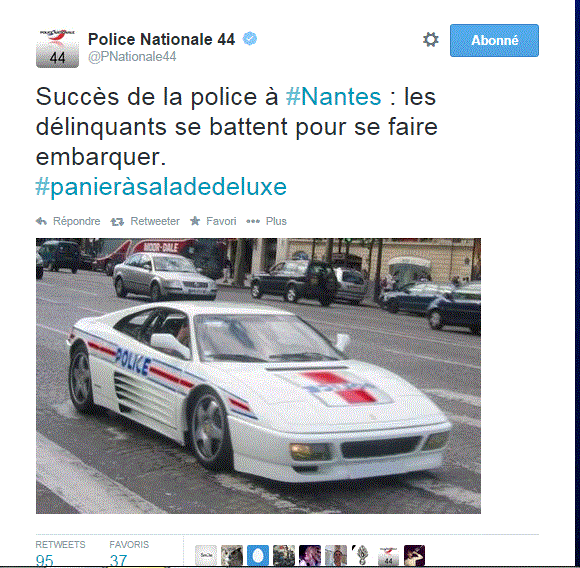 C'est sous le #panieràsaladedeluxe que la police de Nantes diffuse la photo d'une Ferrari relookée en voiture policière. Succès imminent, dans la foulée une vingtaine d'internautes pose des questions, commente, et retweete 95 fois.