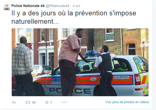 Ailleurs la photo d'un géant discutant avec un Bobby britannique, que les agents ont intitulé « il y a des jours où la prévention s'impose naturellement ». Mais le compte @PNational44 ne se contentent pas de l'humour, il fait également de la prévention.