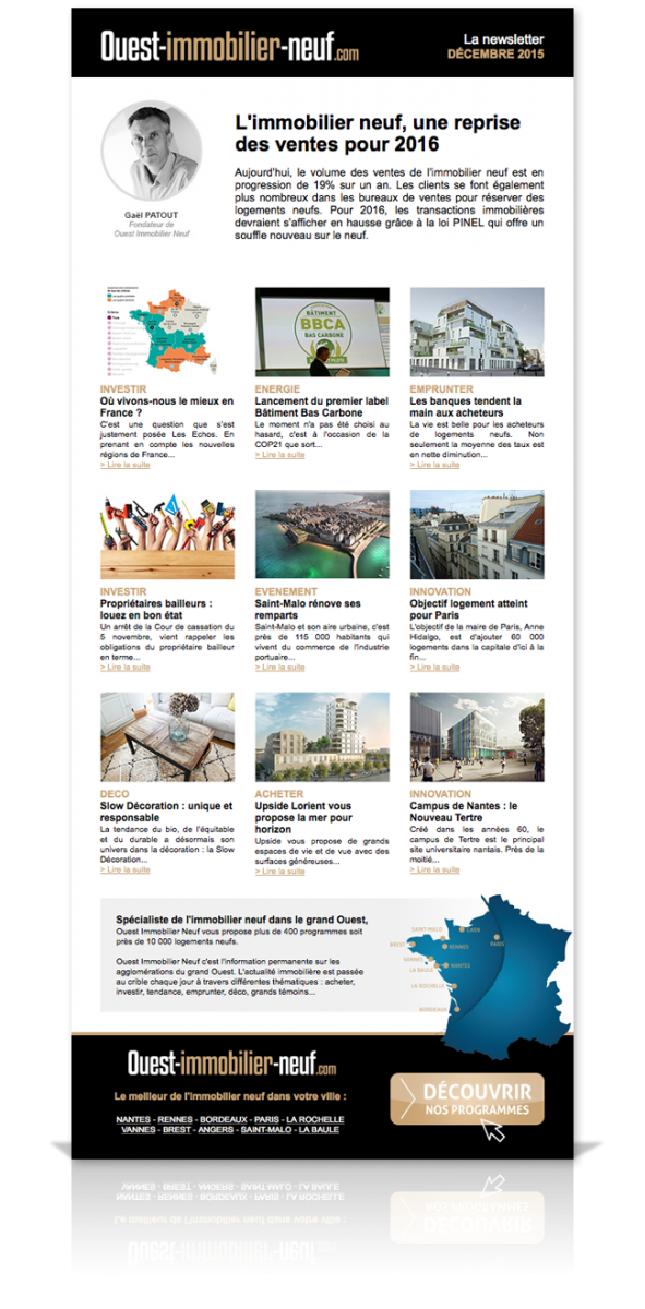 Ouest Immobilier Neuf c’est l’information permanente sur les agglomérations du grand Ouest. L’actualité immobilière est passée au crible chaque jour à travers différentes thématiques : acheter, investir, tendance, emprunter, déco, grands témoins… Ouest Immobilier Neuf a le plaisir de vous présenter sa newsletter pour le mois de décembre 2015. Futurs projets immobiliers, innovations énergétiques, astuces décoration… les actualités les plus fortes de ce mois-ci vous sont proposées.
