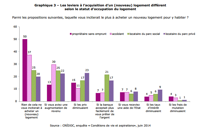 Mais c'est surtout une autre enquête du Credoc qui rend compte du besoin des ménages français d'être bien logés. Au cours d'une de d'un précédent sondage, le centre avait appris que pour 81 % de la population, il est plus important que « tout le monde puisse disposer d'un logement confortable pour un coût raisonnable », plutôt que « tout le monde puisse devenir propriétaire de son logement », cette dernière opinion n'ayant récolté que 19 % des suffrages.
